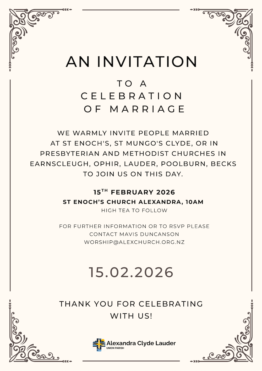 You are warmly invited to join with us in a celebration of marriage on Sunday the 15th of February at 10am at St Enoch's Alexandra, high tea to follow.