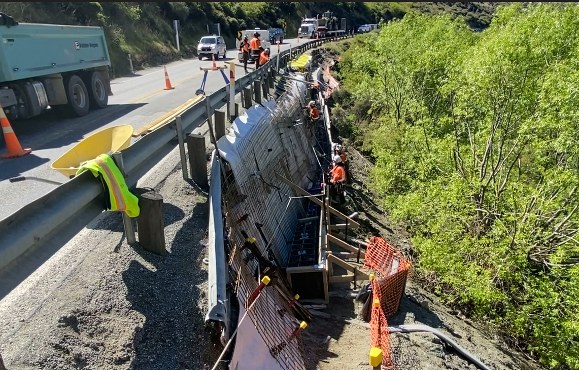 Crews continue work to stabilise an underslip at Scrubby Corner in the Kawarau Gorge. Image: NZTA