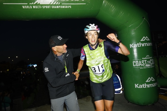 Multisport icon and nine time Coast to Coast winner Steve Gurney congratulated Emma at the finish line. PHOTO: Supplied