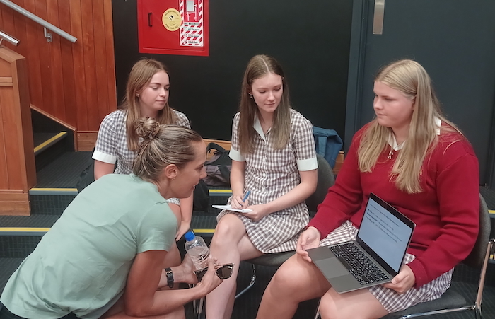Year 13 Dunstan High School pupils (from left) Alessandra Donald, Maeve Stevenson and Jelena Morrell pitch their business idea to Business South’s John Mezger at the Young Enterprise Scheme (YES) Spark Tank. PHOTO: Business South Students from Dunstan High School, Roxburgh Area School, Queenstown’s Liger Academy, and Wānaka’s Mt Aspiring College got a taste of pitching their business ideas at a Young Enterprise Scheme (YES) event last week.
