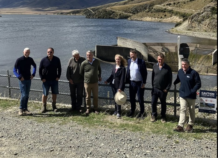 Otago Regional councillors, Minister for Rural Industries Mark Patterson and Manuherikia catchment representatives at Falls Dam following the recent announcement. Image: supplied