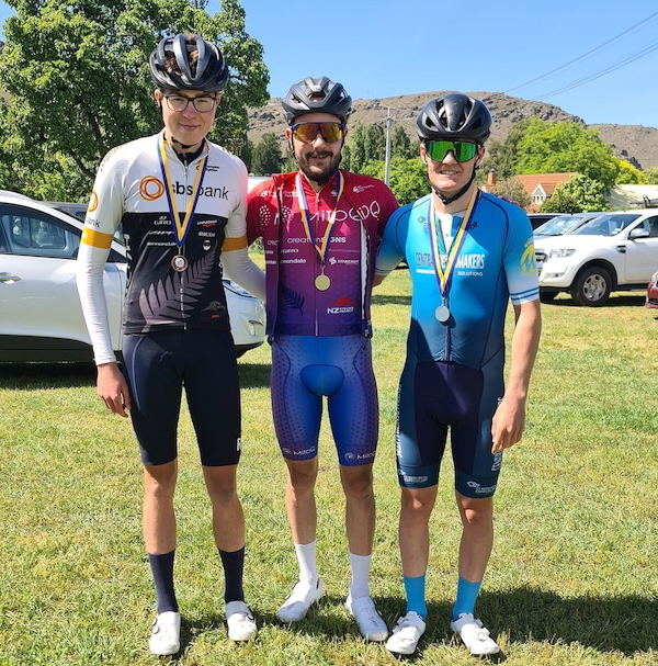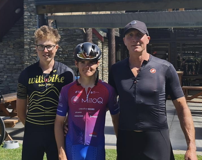 Club cyclist Chris Neville, COWCC committee member Eddie Adams and COWCC president Andy Gillies. PHOTO: Supplied