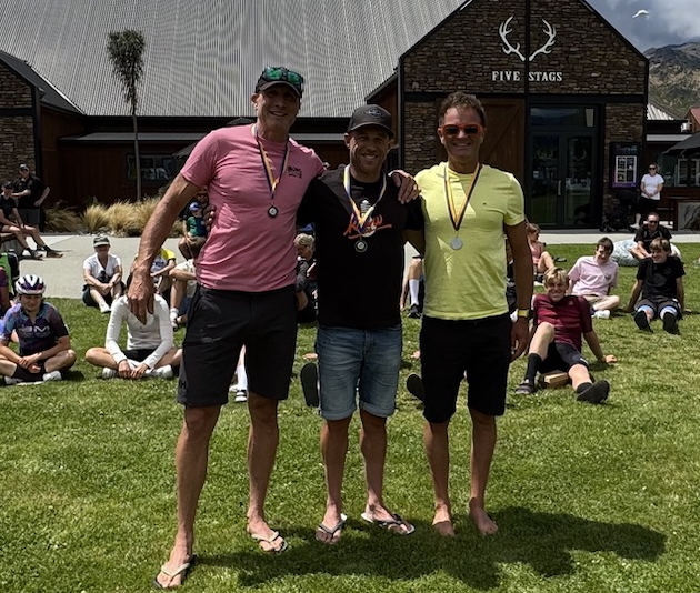 Male masters aged 45-54 podium was Alexandra’s Andy Gillies (third), Invercargill’s Luke Macpherson (first) and Dunedin’s Justin Stott (third). PHOTO: COWCC Facebook
