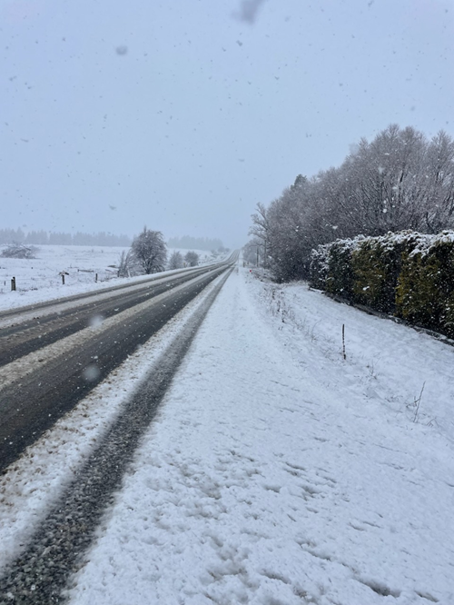Snow has also been reported settling on Williamson Hill, along the Ranfurly side. An update from a Fulton Hogan contractor said Williamson Hill Rd had visible snow cover, with ploughs now heading out.