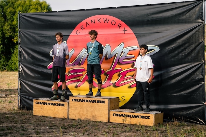 Cooper’s been making podiums for a few years, here he is first place (middle) with Cam Moir (on left) second, and Oscar McNally third in the Crankworx Summer Series (U17) in March 2023. PHOTO: Crankworx