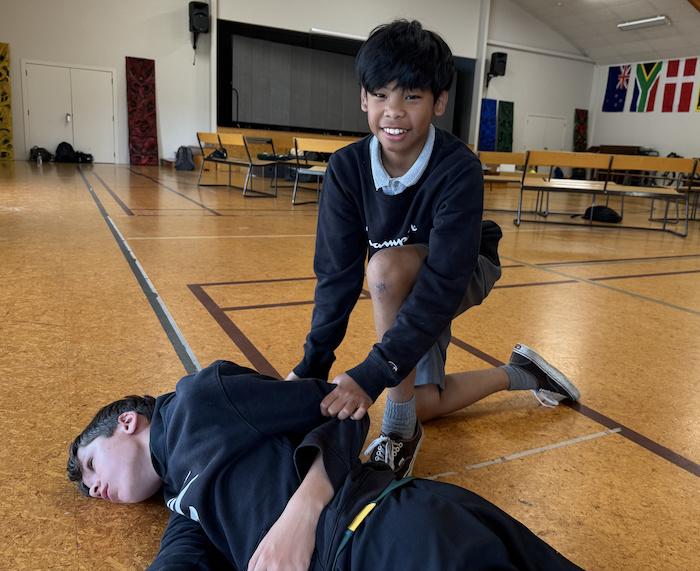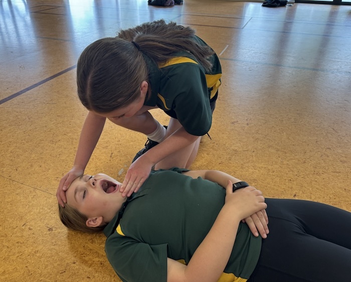 St Gerard’s classmates Stefan Delport pretended to have difficulty breathing in this scenario and Daniel Garcia (both 12) rolled him onto his side to help.