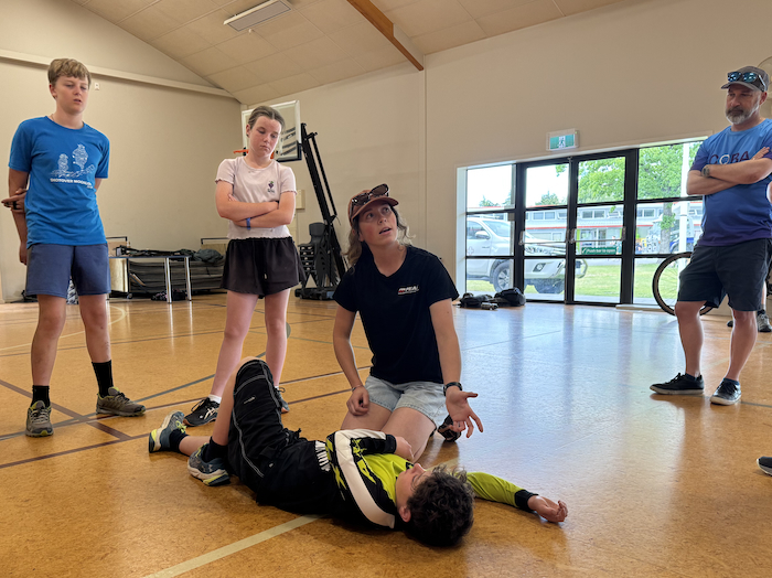 Medic tutor Charlie (kneeling) positions Clyde School pupil Jules Thomson (11) in the recovery position while Alexandra Primary School Year 8 pupils (from left) Jackson Conway and Georgie Miller , and The Terrace School teacher Johnny Webster watch on.
