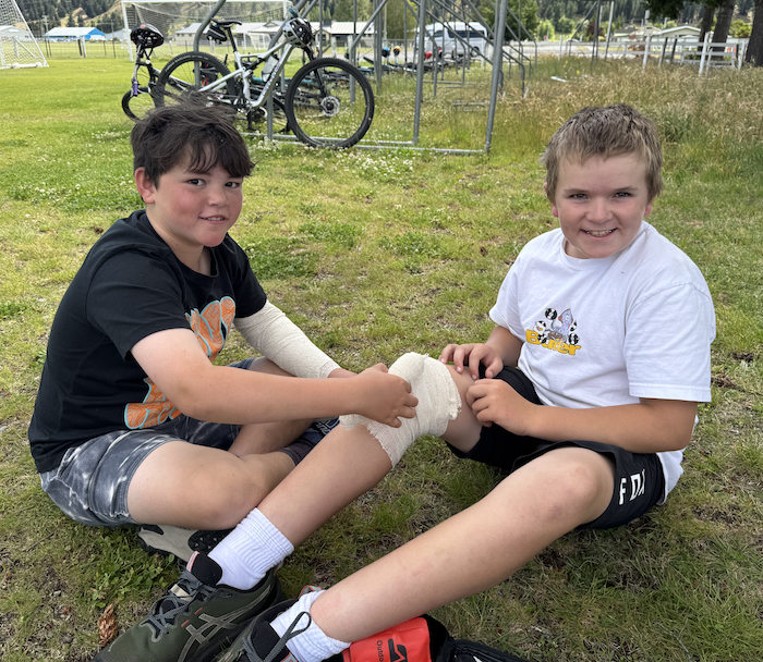 Eleven year old Max (left) bandages fellow Terrace school pupil Austin’s knee after a mock gravel scrape mishap on a mountain bike.