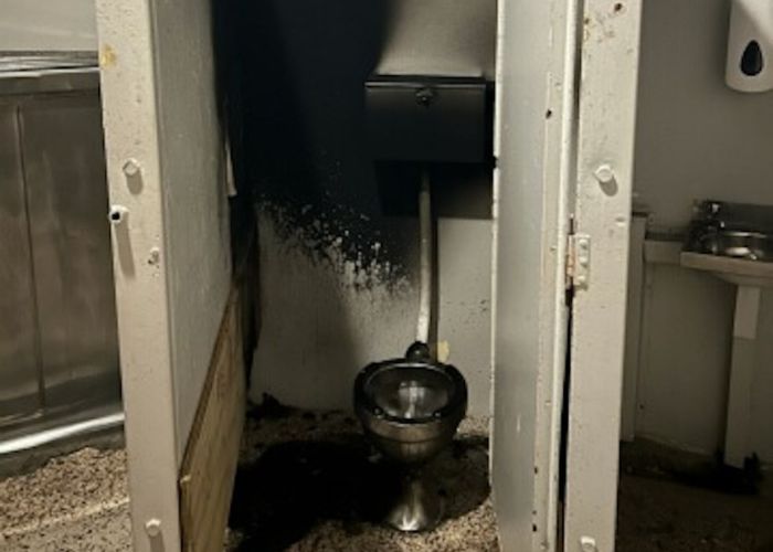 The damage from a deliberately-lit fire at a public toilet in Alexandra, June 2025. Image: Supplied