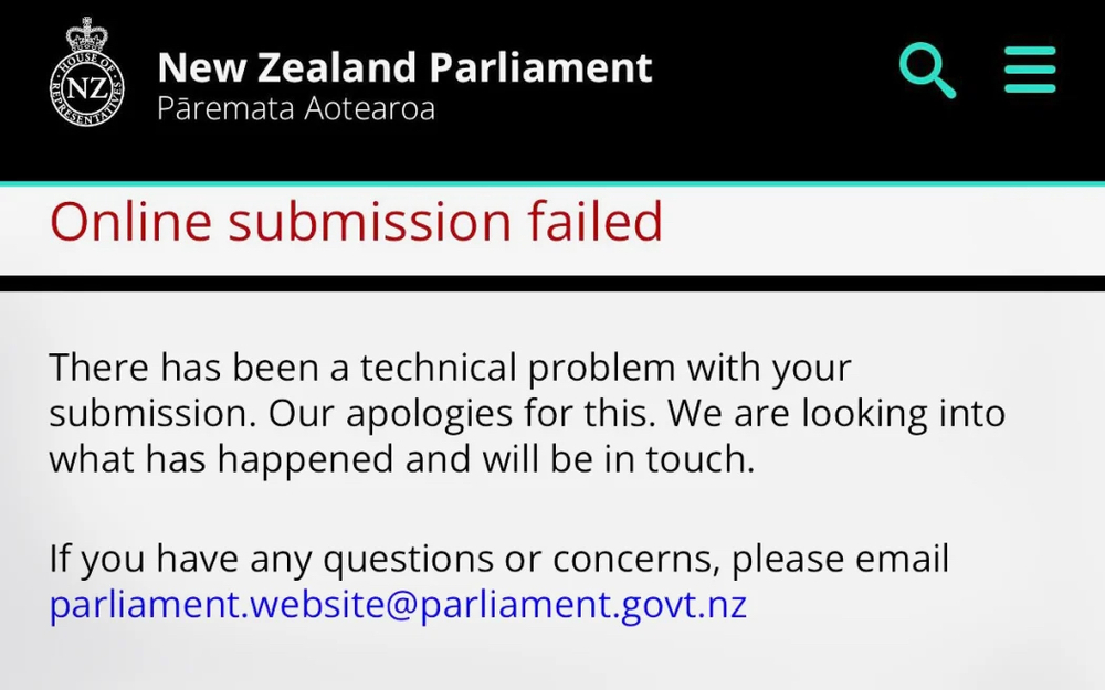 Submissions emailed to treatyprinciples@parliament.govt.nz or justice@parliament.govt.nz between Monday and 9am Thursday will be accepted as a regular submission, provided their email references the technical issues with the website, contains a name, a