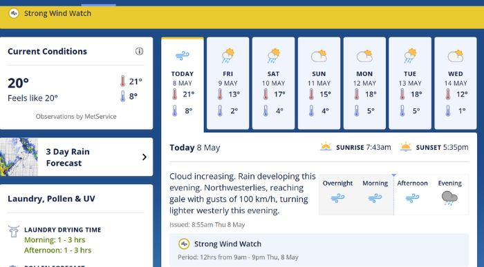 A strong wind watch has been issued for Queenstown Lakes, Central Otago and Clutha west of Tapanui, running from 9am to 9pm Thursday. North-westerly winds may approach severe gale in exposed areas, and there's a moderate chance this could be upgraded to a warning.